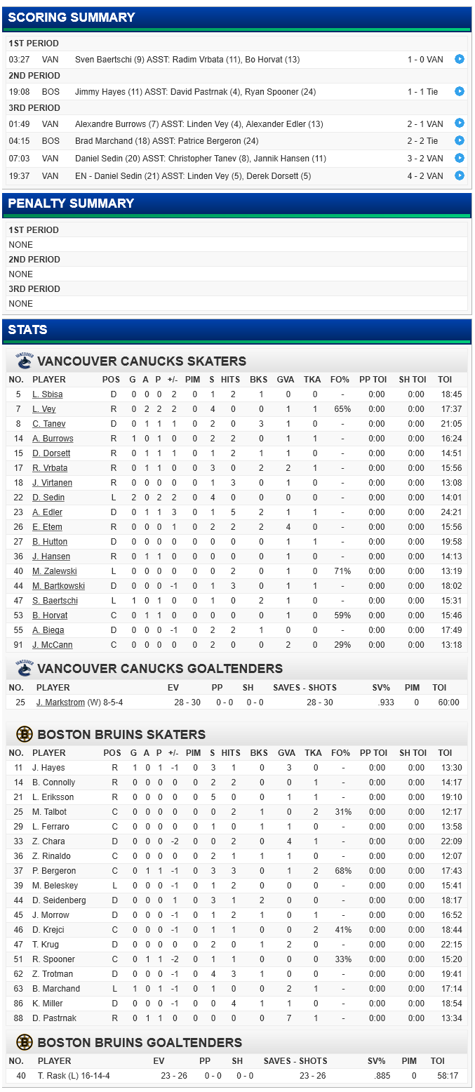 Jacob Markstrom stopped 28 of 30 shots for the Canucks for a .933 Sv%; Sven Baertschi, had his 4rth goal in 6 games (9th of the season); Alex Burrows, had his 2nd goal in consecutive games (7th of the season); Linden Vey had 2 assists; but it was Daniel Sedin who rose up with two unanswered goals to put the game away for Vancouver, the last one an empty netter, as the Canucks finally won their 20th game of the season, defeating Boston 4 to 2.