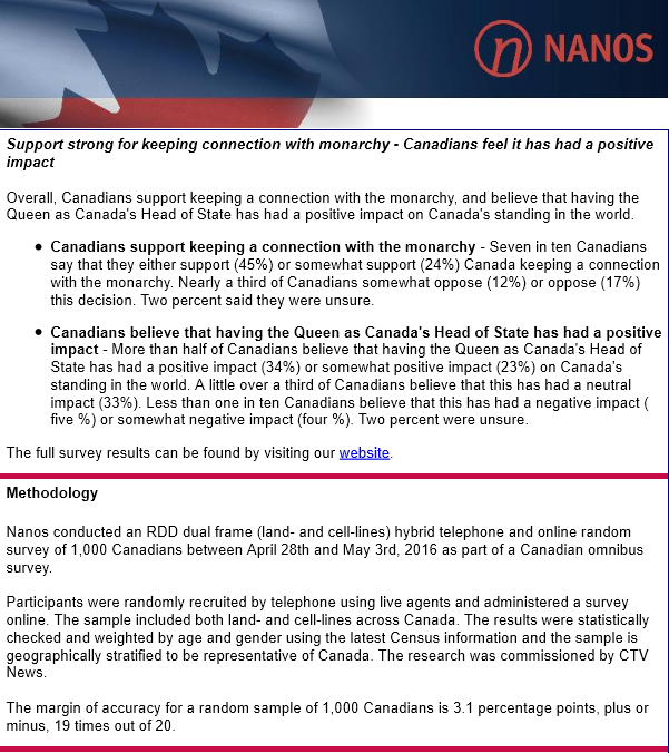 These observations are based on a hybrid survey commissioned by CTV News and conducted by Nanos Research. Individuals were randomly recruited (land- and cell-line sample using live agents and the survey was administered online random survey completed between January 30th and February 1st, 2016. It was comprised of 1,000 Canadians. A random survey of 1000 Canadians is accurate 3.1 percentage points plus or minus, 19 times out of 20.