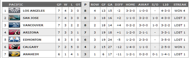 The Canucks are currently tied with San Jose and Los Angeles for 1rst-place in the Pacific Division of the Western Conference with 8-points. Arizona and Edmonton are right behind them with seven and six points respectively.