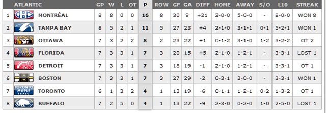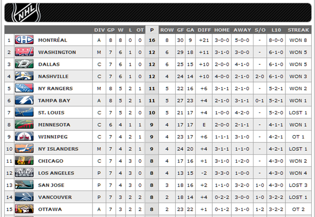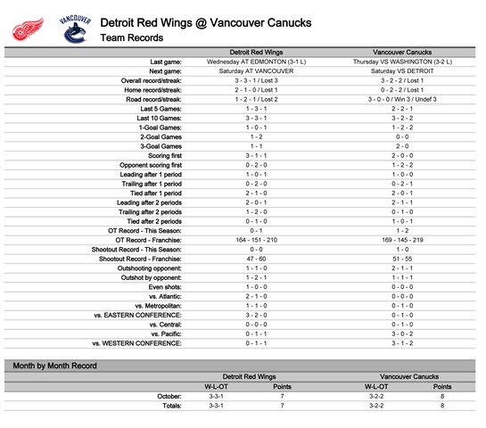 Vancouver is among the top 15-teams in the NHL, and are tied for the 6th best team in the league with their 8-points. The Montreal Canadians are the  top team with 16-points, unbeaten from the start of the season with an 8-game winning streak, all wins in regulation play.