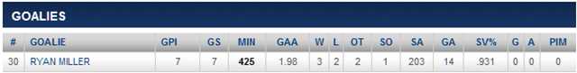 Ryan Miller made 25 saves through overtime and six more in the shootout.