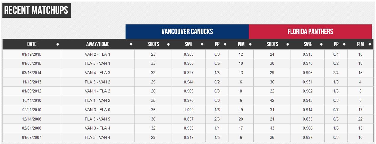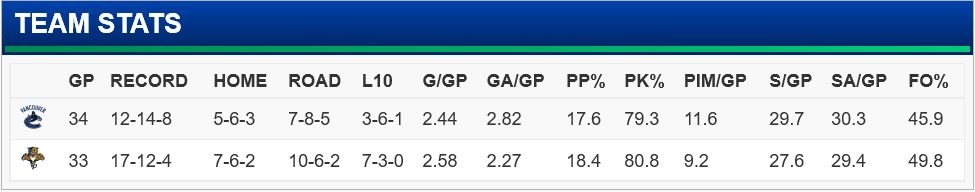 Vancouver out shot the Panthers, 13 to 7; were 8 for 19 on face-offs; had 5 giveaways; were 0 for 2 on the power play; and 1 for 1 on the penalty kill.