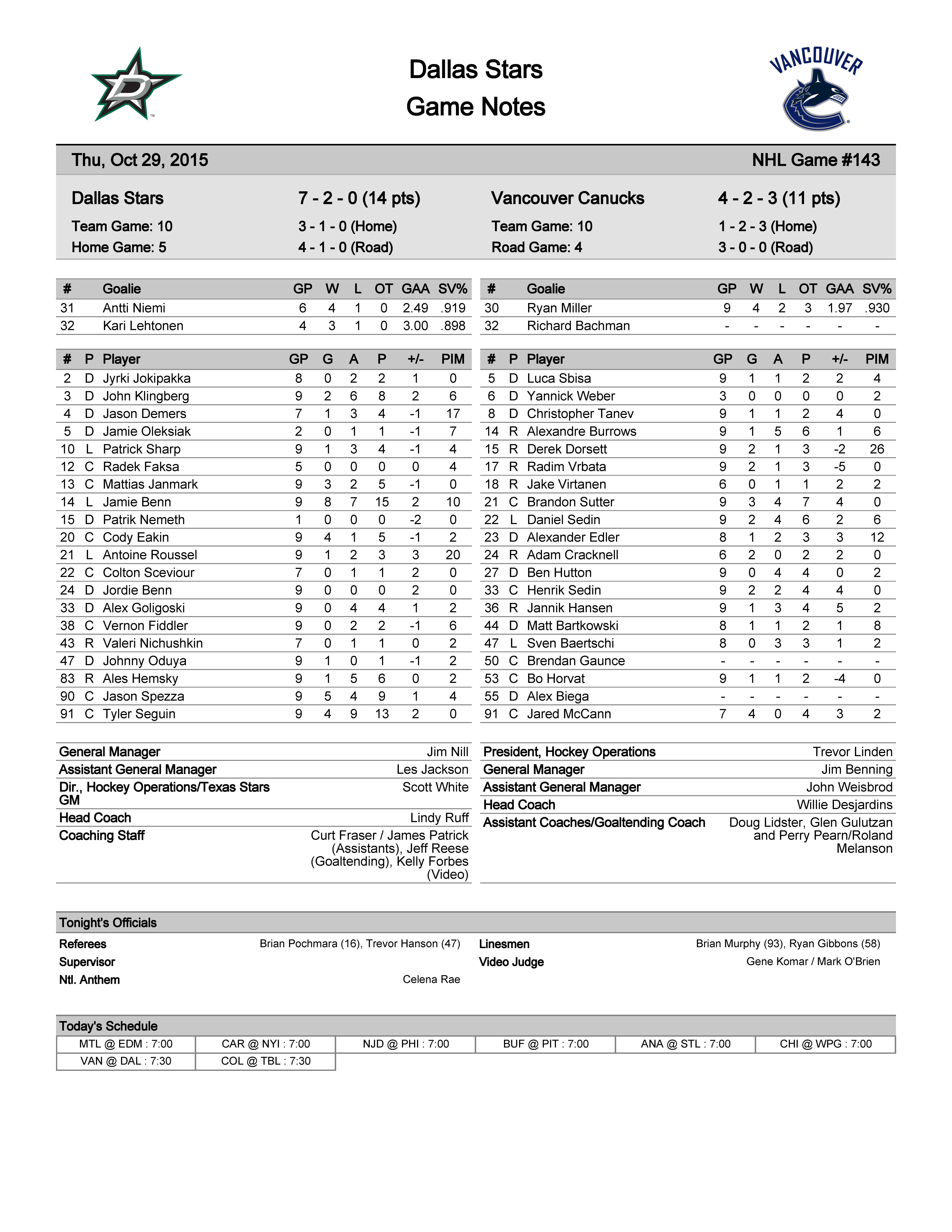 For the Stars, Jamie Benn leads Dallas with 15-points, and 8-goals. Tyler Seguin and Jason Spezza have 13-points and 9-points respectively. Seguin leads the team with 9-assists.