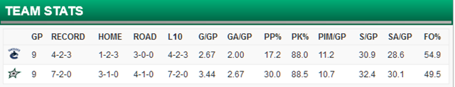 Dallas has scored 31 goals, good for 3rd best in the NHL, while Vancouver is tied for 9th best with Edmonton having scored 24 goals so far this season.