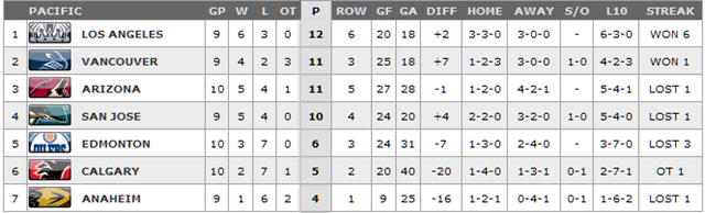 The Canucks are currently tied for 2nd-place, with Arizona, in the Pacific Division of the Western Conference with 11-points; 1-point behind Los Angeles, who are alone in first place. San Jose is currently in 3rd sport with 10-points. Vancouver, Los Angeles and San Jose all have a game in hand on Arizona.