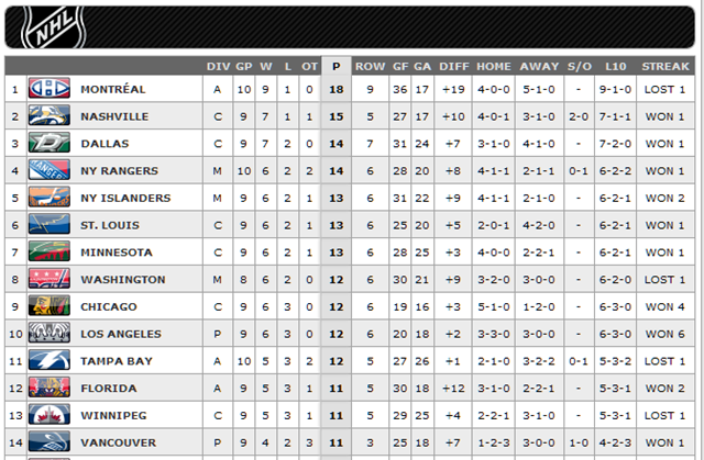 Vancouver is among the top 14-teams in the NHL, and are tied for 6th best team in the league with their 11-points. The Montreal Canadians are the top team with 18-points, with 1-loss and 9-wins, all wins in regulation play.