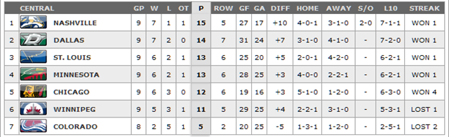 Dallas is currently in 2nd-place in the Central Division of the Western Conference, with 14-points, 1-point behind first place Nashville who lead the division with 15-points. St. Louis and Minnesota are tied for 3rd-place with 13-points, one point ahead of Chicago who have 12-points in 4rth.
