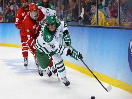 Stecher’s breakout season for North Dakota saw him go from 13 points to 29. He was the sixth-most productive defenceman in college hockey, and that was like chum in the water for NHL teams.