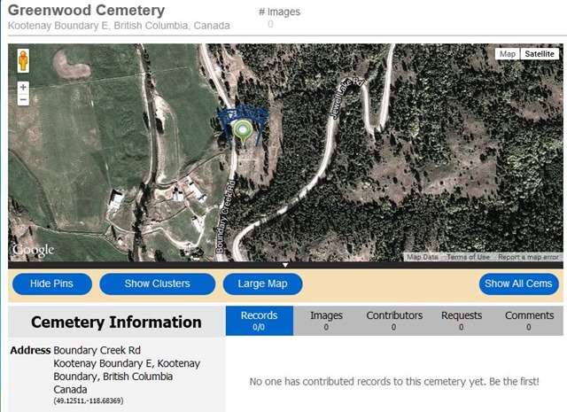 Below is a photo showing the location of the cemetery off of Highway #3, along Boundary Creek Road, just after the turnoff to Jewel Lake.