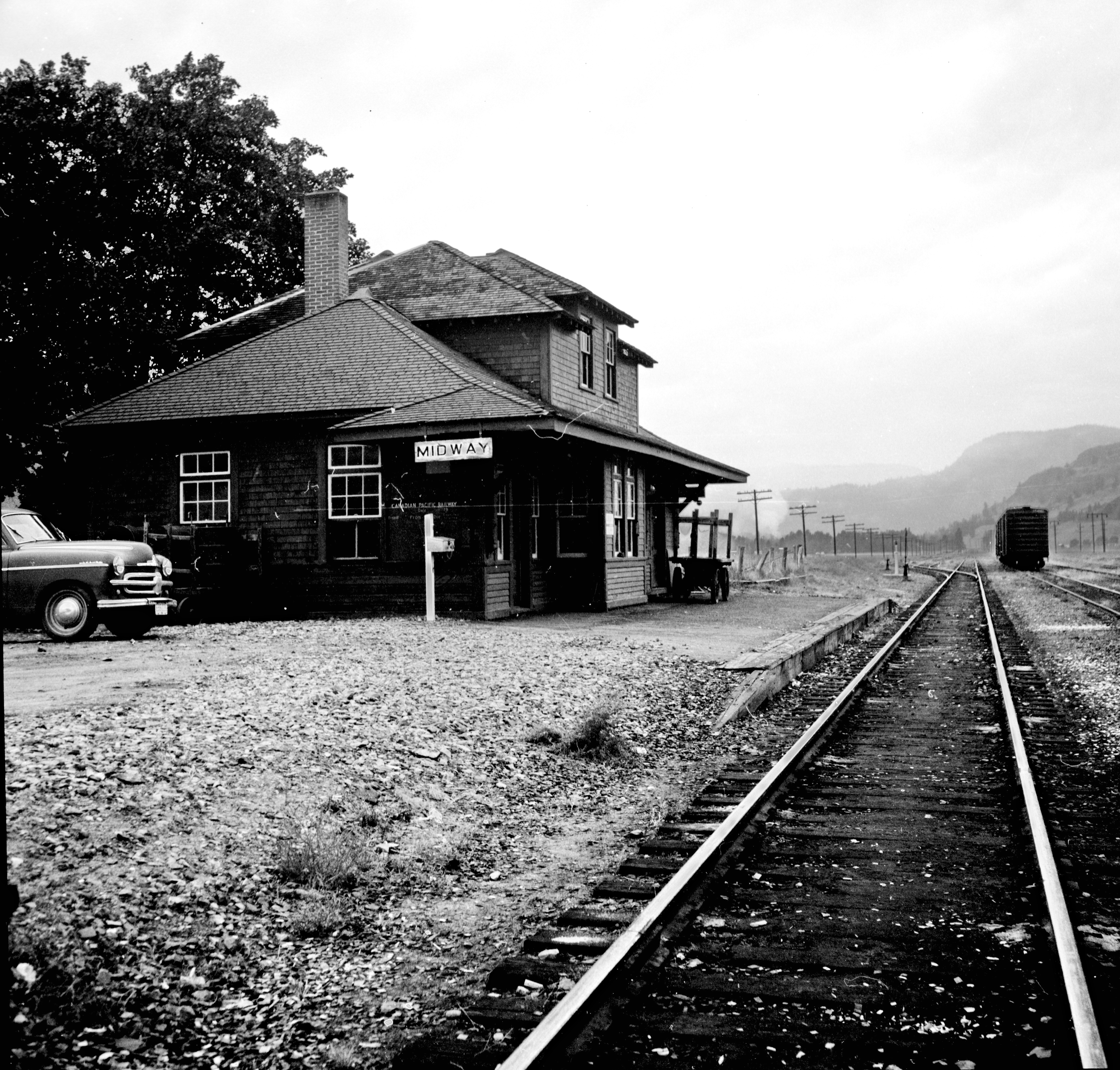 Midway CPR depot Photograph taken by David Davies. Northern BC Archives & Special Collections Reference code 2013.6.36.1.028.01 Date(s)17 Sept. 1970 (Creation) Photograph depicts the Midway CPR depot located at the eastern terminus of Kettle Valley Railway. It was a subdivisional point with way freights originating at Nelson and Penticton, and running west and east respectively to Midway. There are two to 3 freights weekly from Nelson and 1 to 2 from Penticton. It lost its agency in June 1969 and all small freight
