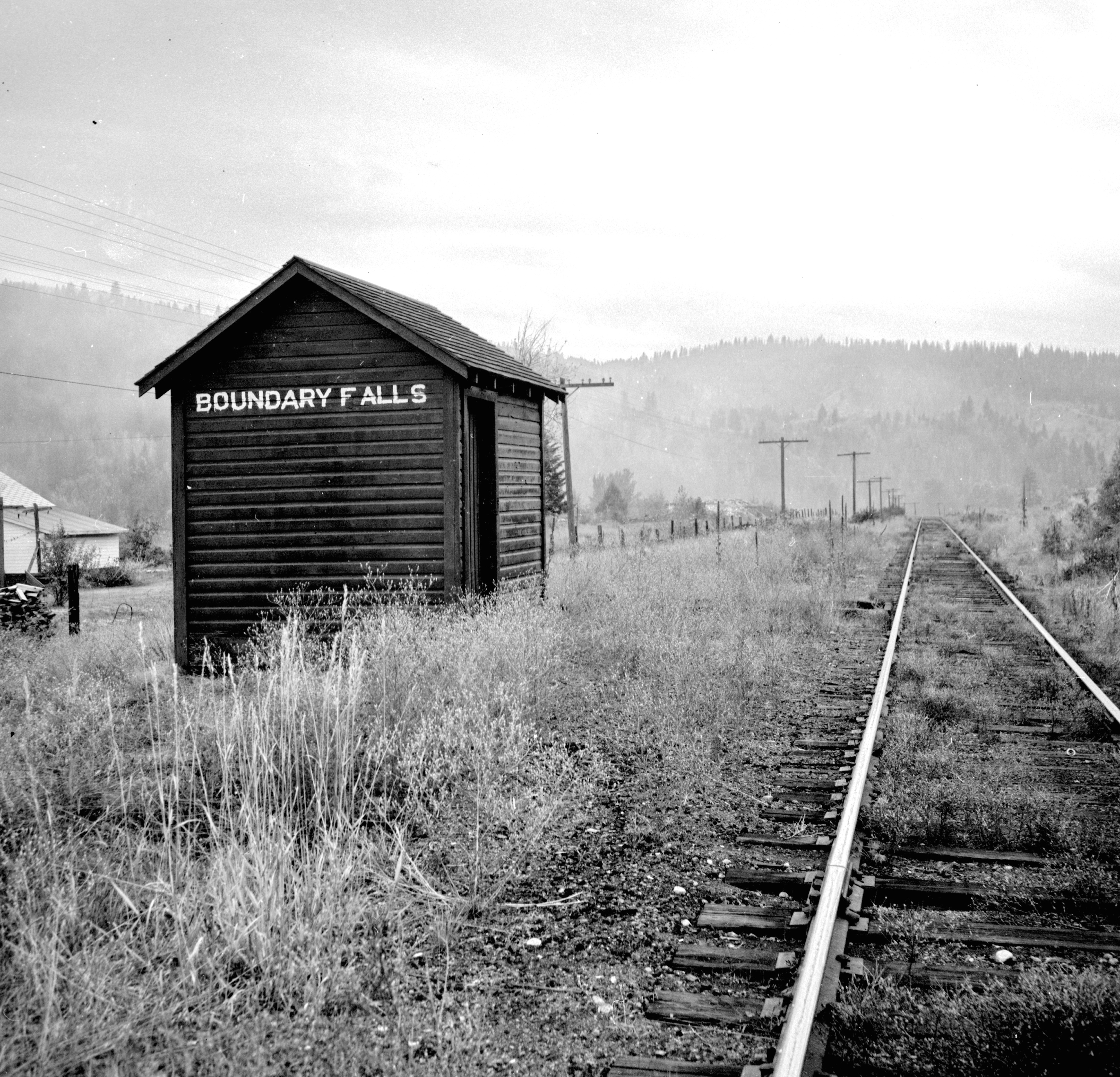 CPR line at Boundary Falls Photograph taken by David Davies. 14 Sept. 1970 (Creation) Photograph depicts the CPR line at Boundary Falls, which is at mile 121 from Nelson on the Boundary Subdivision. The view is looking west and it shows the former flag stop shelter.