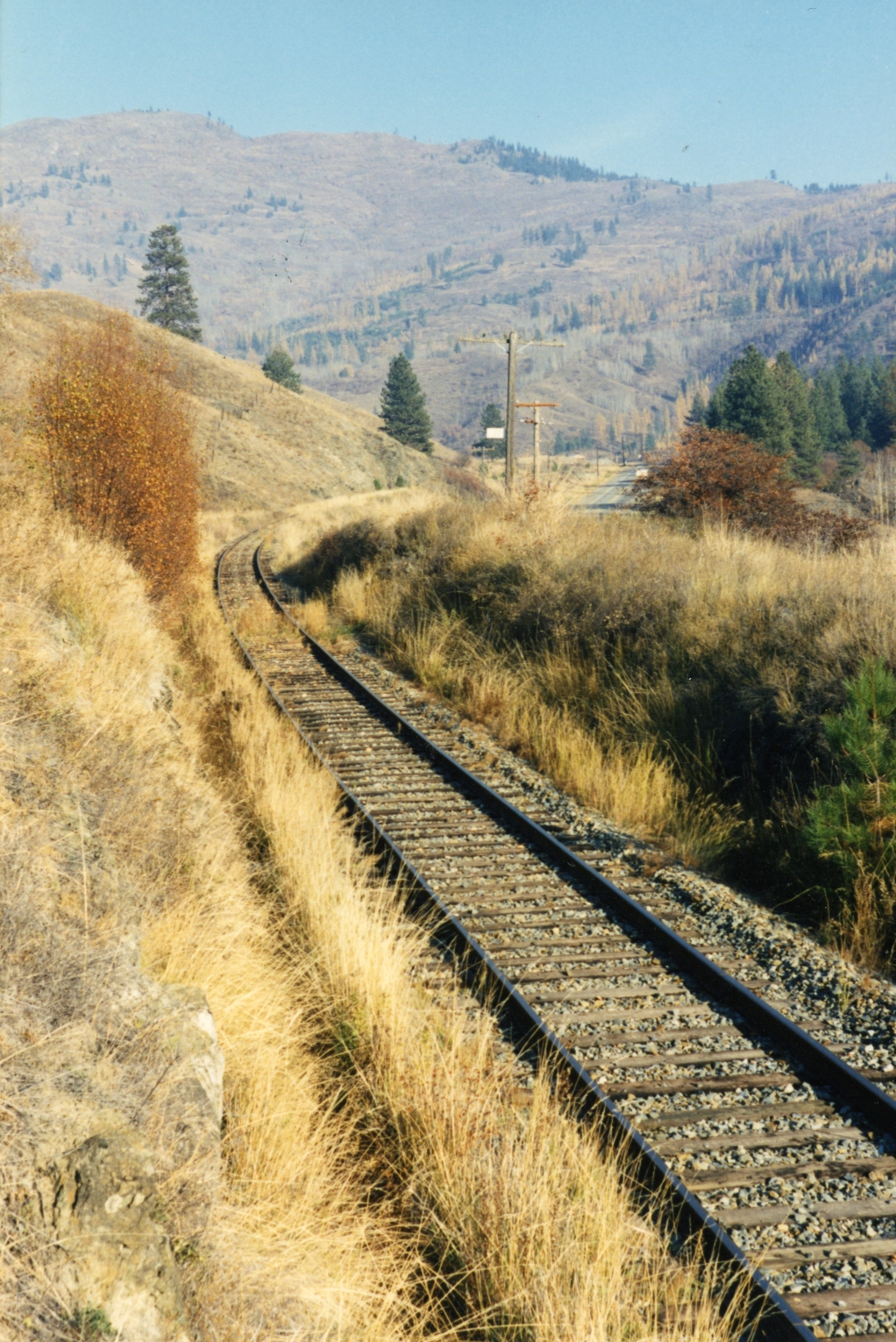 KVR (CPR) between Boundary Falls and Midway Photograph taken by David Davies. Northern BC Archives & Special Collections Reference code 2013.6.36.1.155.10 Date(s) Nov. 1989 (Creation) Photograph depicts KVR (CPR) trackage between Boundary Falls and Midway. The line had not yet been officially abandoned, but it was little used, if not at all.