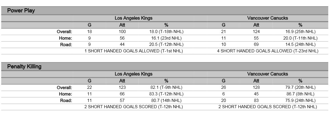 - Even Strength: Vancouver-6; Kings-19