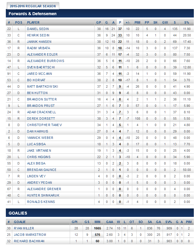 Jared McCann scored the winner in the last minute of the second period. Emerson Etem and Jannick Hansen had goals. The Sedin brothers chipped in with assists, along with Derek Dorsett and Bo Horvat. Ryan Miller stopped 35 of 37 shots for a .946 Sv%.