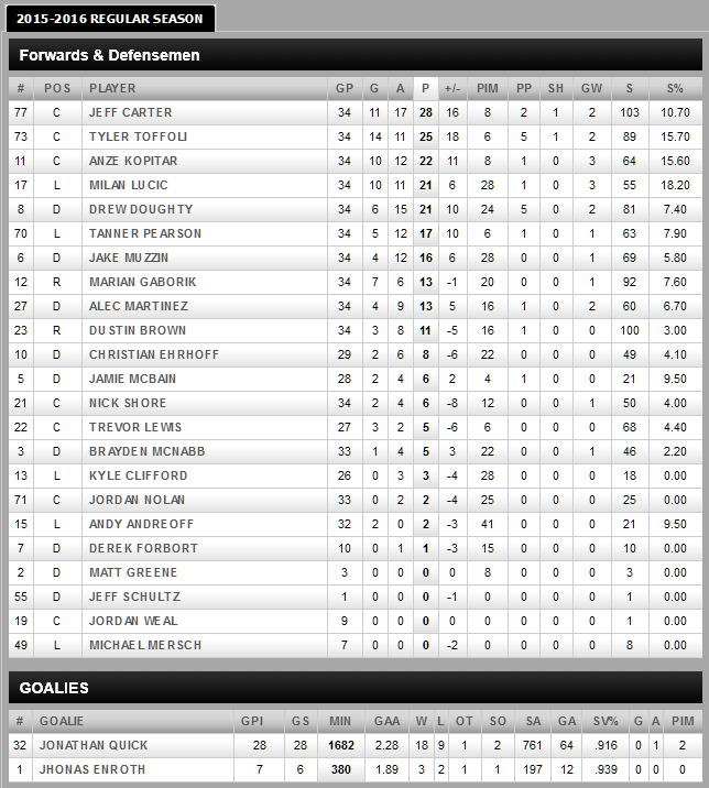 Tyler Toffoli, his 30th of the season, assisted by Jeff Carter (37) and Drew Doughty (36).