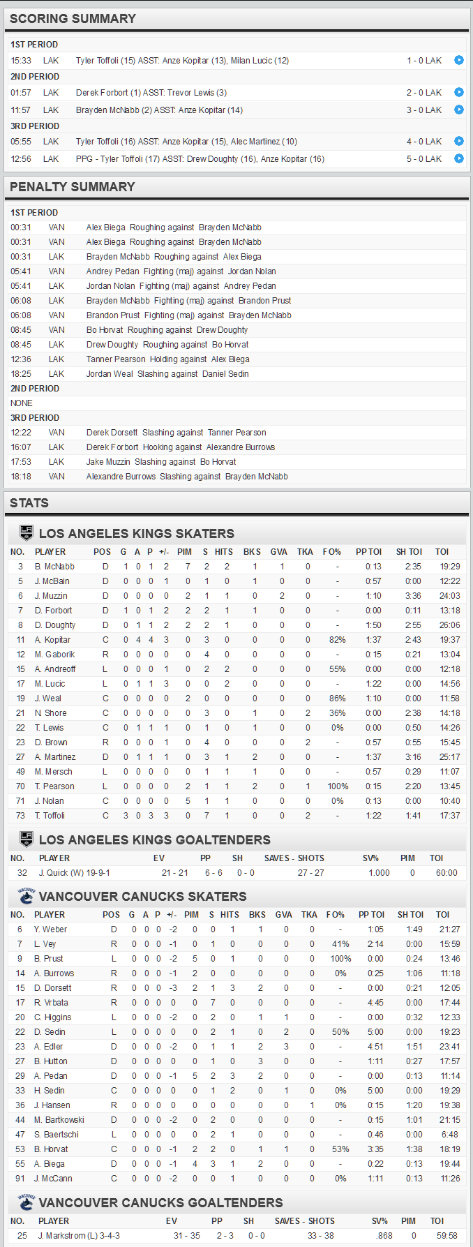 Vancouver would get another chance to improve their power play efficiency when at 14:54 Drew Doughty would visit the sin bin for tripping Jannick Hansen. Need I say more? That’s right, they are now 1 for 40.