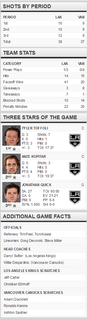 - Vancouver finished with 24 shots, Los Angeles 42 shots, and Canucks won 21 of 57 face-offs.