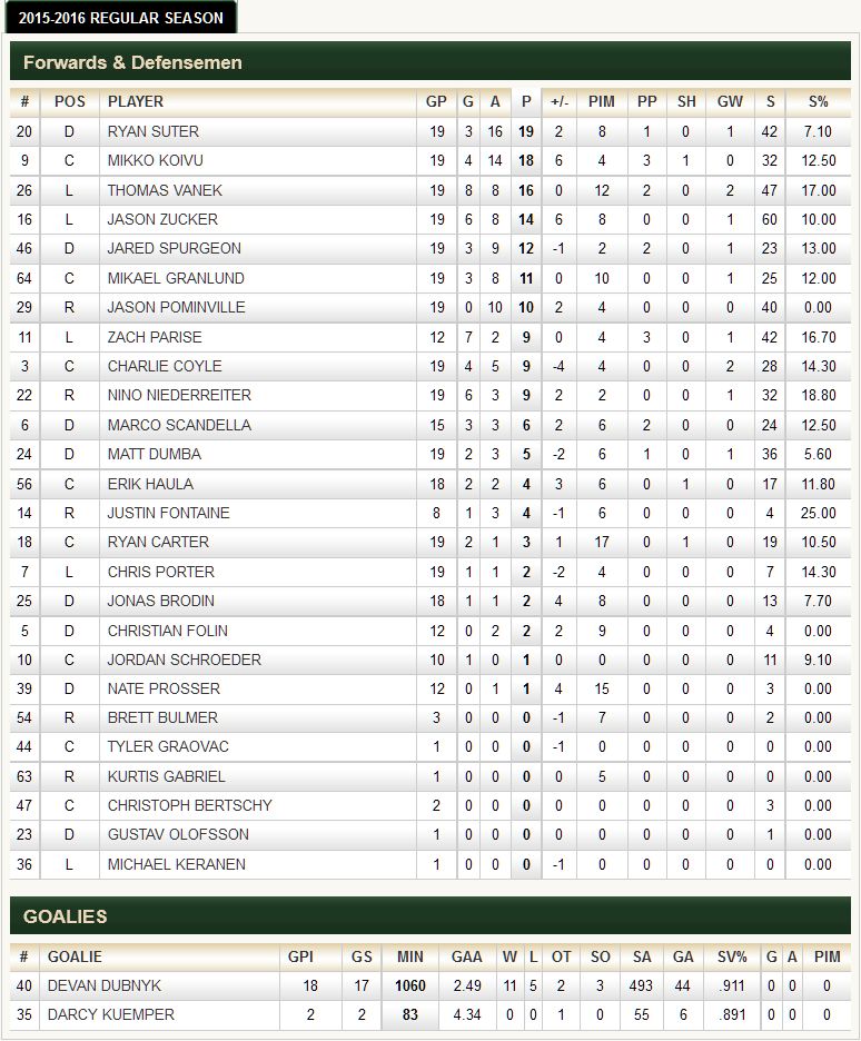 - At the end of two, Zach Parise led both teams in shots with 8, with teammates Jason Zucker and Ryan Suter having 4 each.