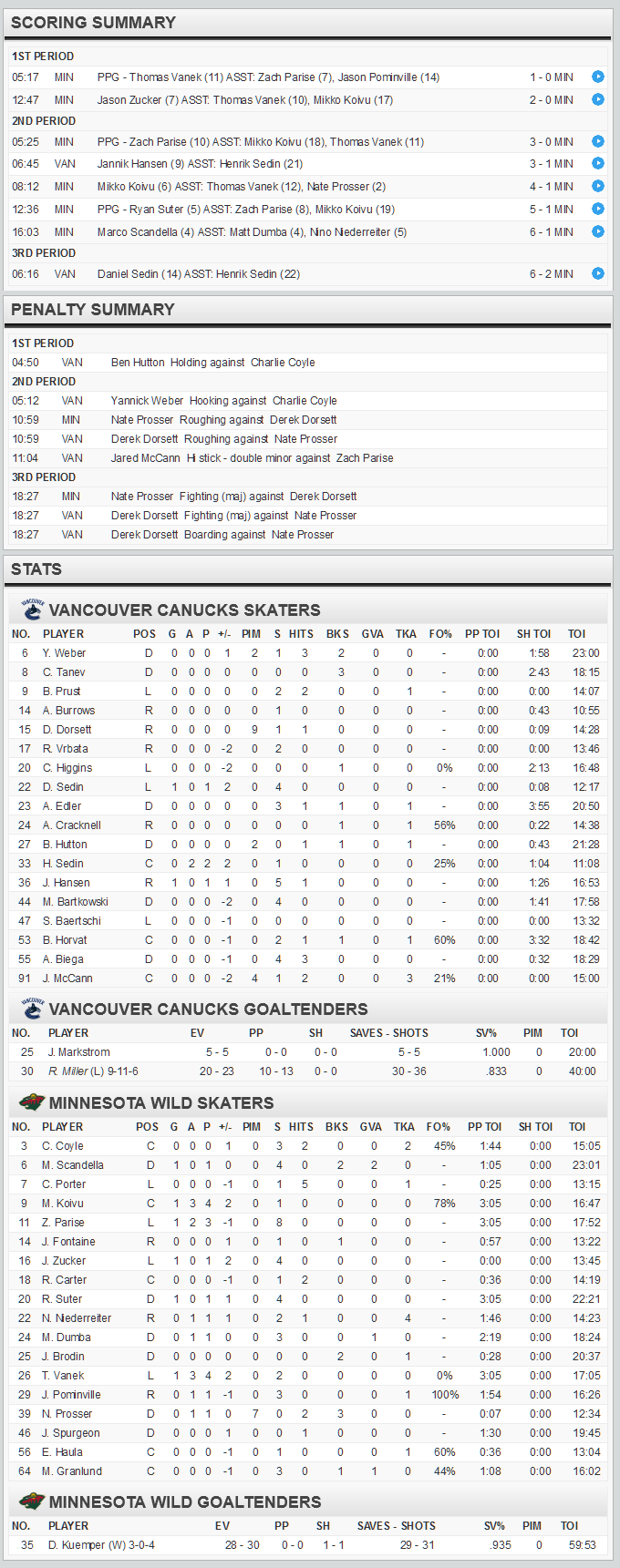 The final period started with a new goalie for Vancouver as coach Willie Desjardin replaced Ryan Miller with Jacob Markstrom, and Minnesota took their hand off the throttle, as there would be only one goal scored.