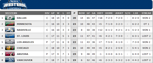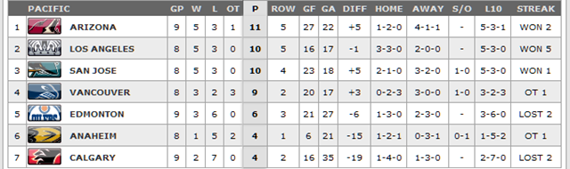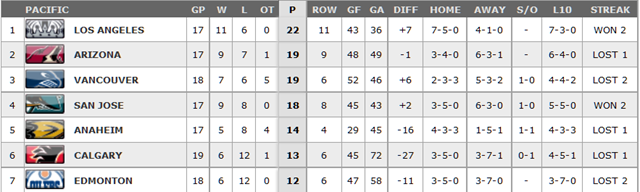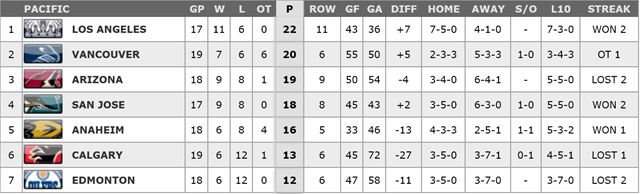 Los Angeles and San Jose have 2 games in hand on Vancouver, while Arizona, Anaheim and Edmonton, each have a game in hand on the Canucks.
