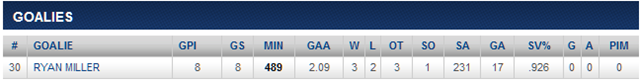 with 21. - Ryan Miller ranks first in a number of statistical categories this season including games played/started (16), TOI (966:31) and shots