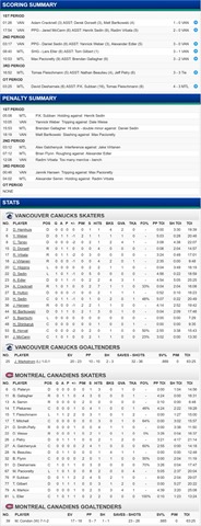 A shorthanded goal by Lars Eller, and an even strength goal by Max Pacioretty made the score 3-2 Vancouver after two periods. An even strength goal by Tomas Fleischmann with just over three minutes left in regulation evened things up for Montreal, who seemed down and out for the count nearing the middle of the second period.