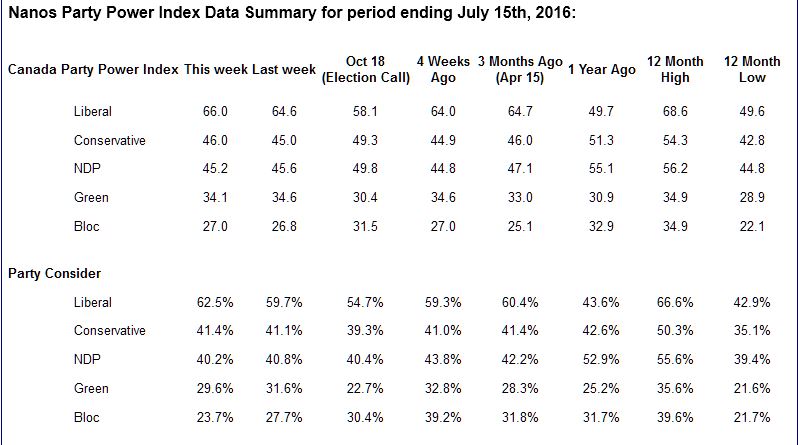 - Nanos Party Power Index – The Nanos Index which is a compilation of a series of questions including ballot preferences and impressions of the leaders has the Liberals with 65.1 out of a possible 100 points. The Conservatives scored 46.3 points, the NDP 43.9 points, the Greens 34.8 points and the BQ 23.7 points (QC only).