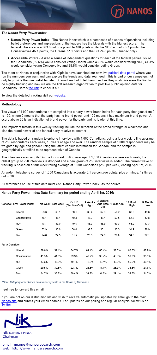 Federal Liberals continue to score highest on Nanos Index (ending April 1, 2016) Posted on April 6, 2016 by CanucksBanter