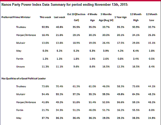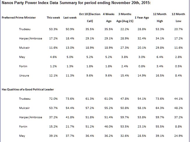 Nanos conducted an RDD dual frame (land- and cell-lines) hybrid telephone and online random survey of 1,000 Canadians, 18 years of age or older, between November 21st and 24th, 2015 as part of an omnibus survey. Participants were randomly recruited by telephone using live agents and administered a survey online. The sample included both land- and cell-lines across Canada. The results were statistically checked and weighted by age and gender using the latest Census information and the sample is geographically stratified to be representative of Canada. Canadians without internet access or telephone lines were excluded by default.