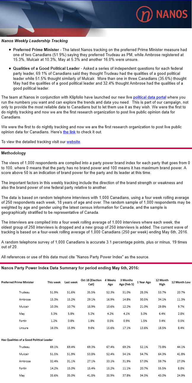 Six months after winning election Trudeau enjoys 37 point advantage as preferred PM in Nanos tracking (ending May 6, 2016) Posted on May 10, 2016 by CanucksBanter