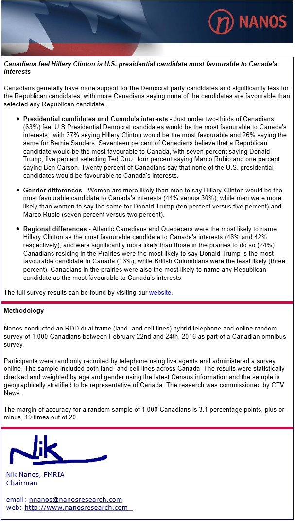 “Although the overall week over week numbers were steady, the tracking hit a new six month low on the future strength of the Canadian economy,” said Nanos Research Group Chairman Nik Nanos.