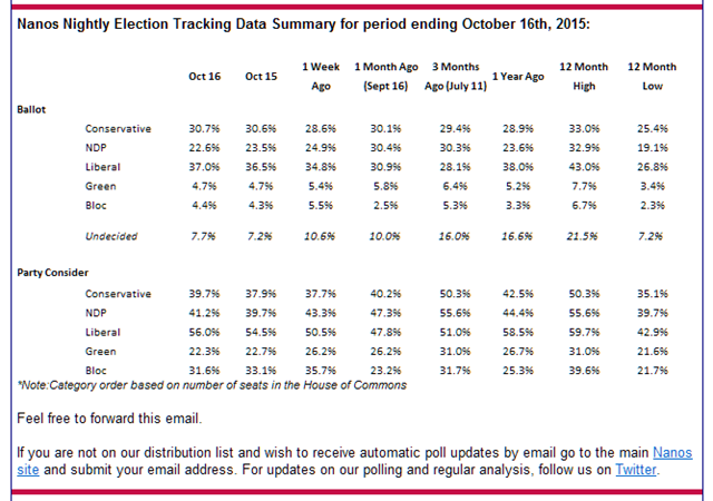 Nanos Nightly Election Tracking Data Summary for period ending October 18th, 2015: