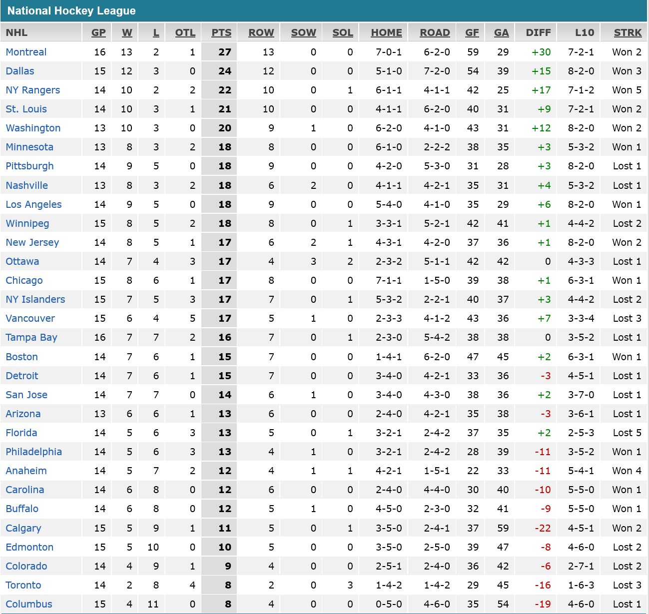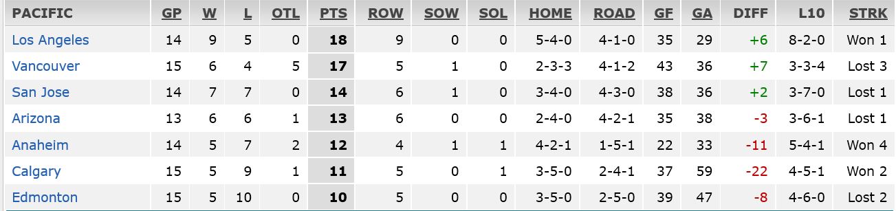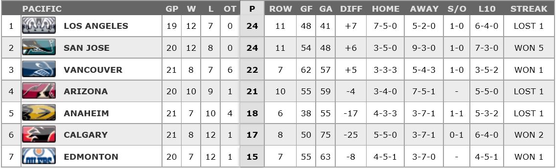 Vancouver is in 3rd place in the Pacific division, with 22-points, two points behind Los Angeles and San Jose, who are currently tied for 1rst place in the division with 24-points.