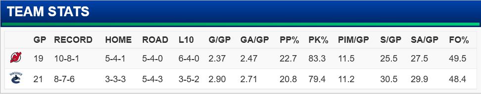 The New Jersey Devils (10-8-1), in 5th place in the Metropolitan division, come into Vancouver(8-7-6), 3rd place in the Pacific division, after losses to the Calgary Flames and Edmonton Oilers.