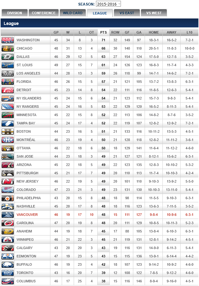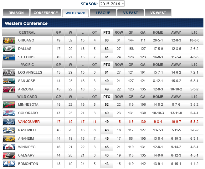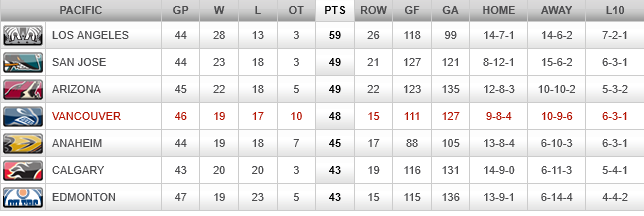 The Canucks are in 4rth place in the Pacific division of the Western Conference, tied with Arizona and San Jose for 2nd place with 49 points. Vancouver are 4 points in front of Anaheim and 12 points behind the first place Los Angeles Kings.