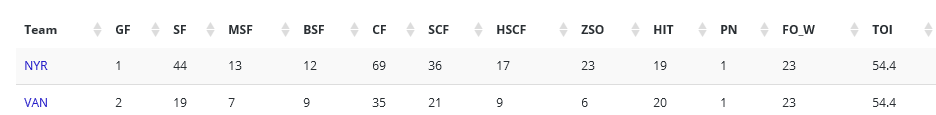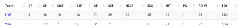- Corsi For: Even Strength 5v5: Rangers-23; Canucks-17. All Situations: Rangers-23; Canucks-17.