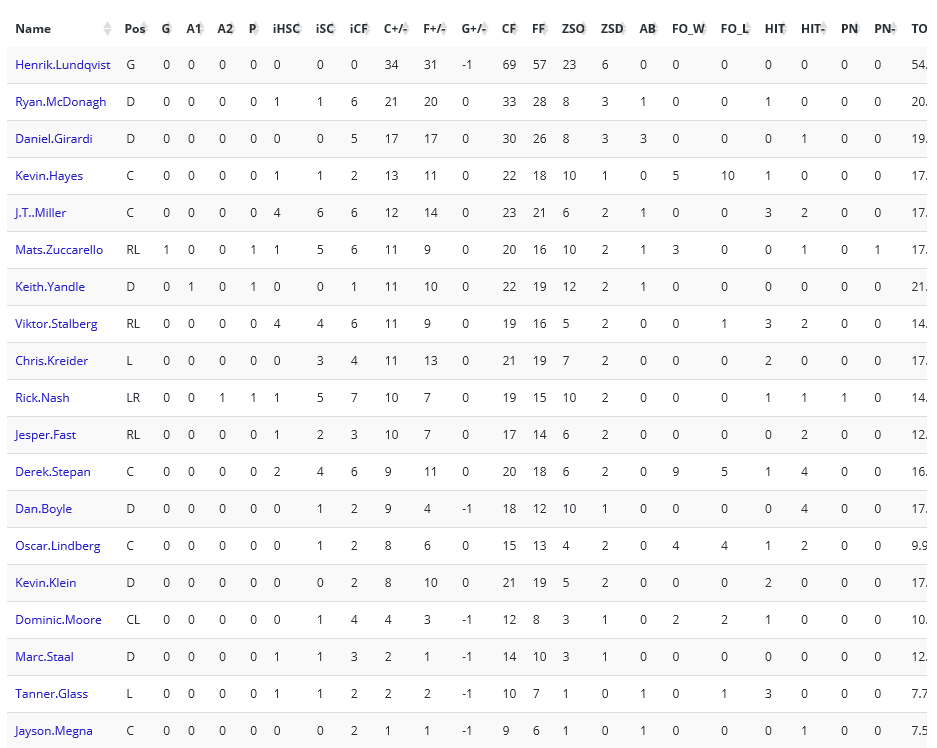 RANGER PLAYERS CORSI STATS