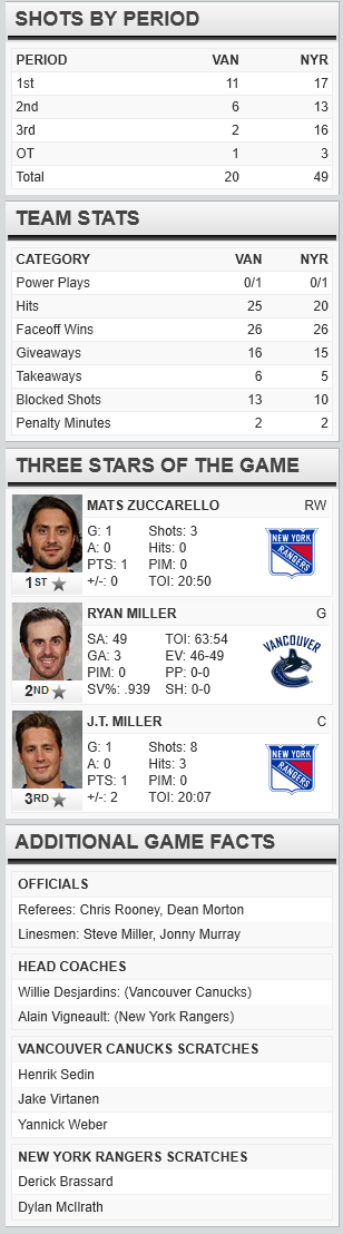 Ryan Miller made 46 saves for the Canucks, but it was not enough, as the Rangers tied the game up at 2-2 late in the game, forcing overtime, where the Rangers scored, to take the game 3-2.