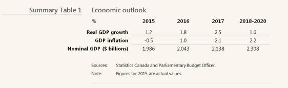 PBO projects that growth in real gross domestic product (GDP) will rebound to 1.8 per cent in 2016 and then rise to 2.5 per cent in 2017. Economic growth is then expected to moderate over 2018 to 2020, reflecting the tapering of fiscal measures and the normalization of monetary policy.