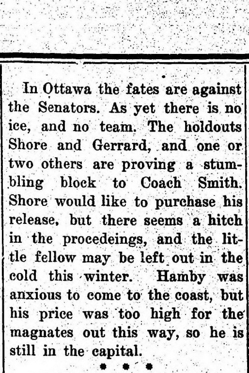 Ottawa Players Refusing To Sign Up Posted on August 27, 2013 by CanucksBanter Shore, Duford Holding Out For As Much As Nighbor From: The Western Call, Vancouver, B.C., December 3, 1915