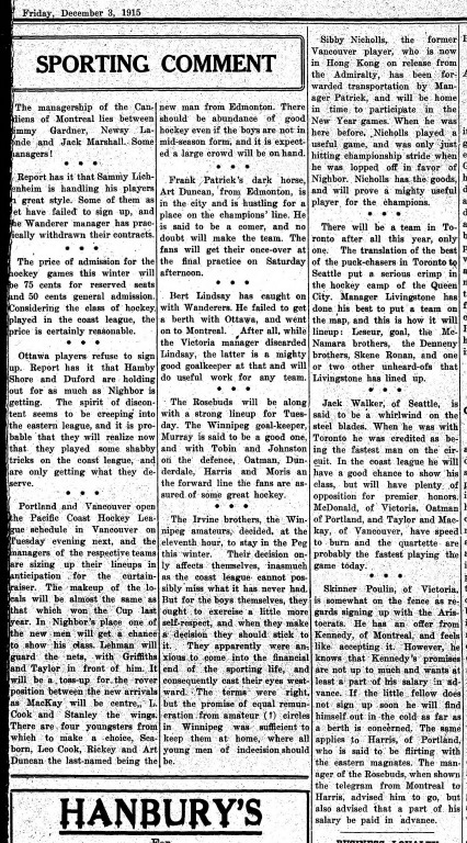 Wanderers Leads N.H.A., Vancouver Wins Over Seattle in PCHL Action Posted on August 30, 2013 by CanucksBanter From: The Western Call, Vancouver, B.C., December 31, 1915