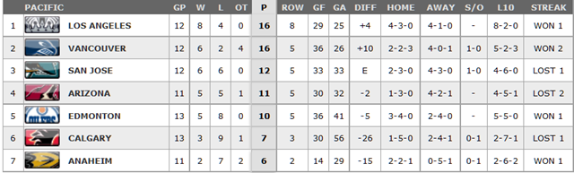 Canucks are a single point ahead of San Jose and Calgary; three points ahead of Edmonton and four points in front of Anaheim.